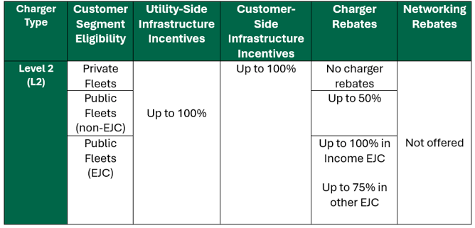 • National Grid offers rebates for charger hardware for fleet customers depending on which criteria of the state definition of “environmental justice” the location of the charger meets