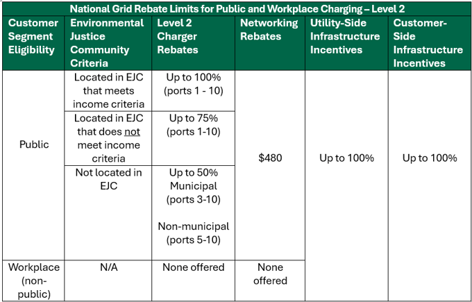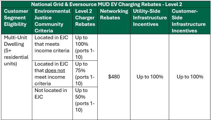 - National Grid and Eversource cover up to 100% of infrastructure upgrades for Level 2 charging